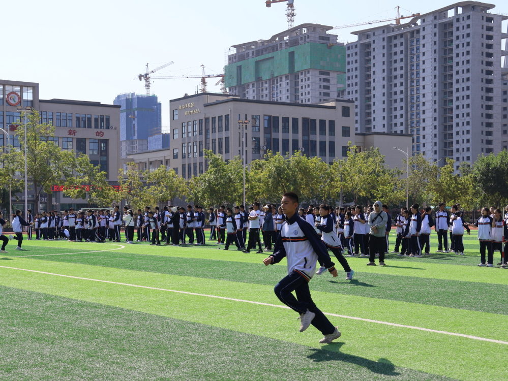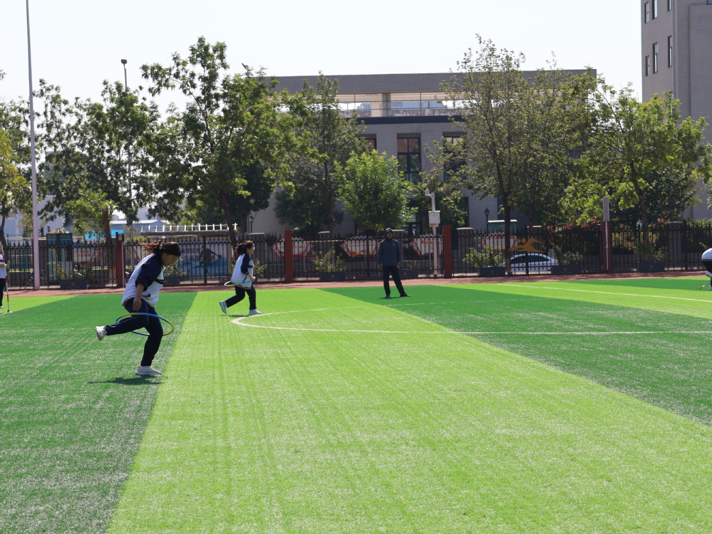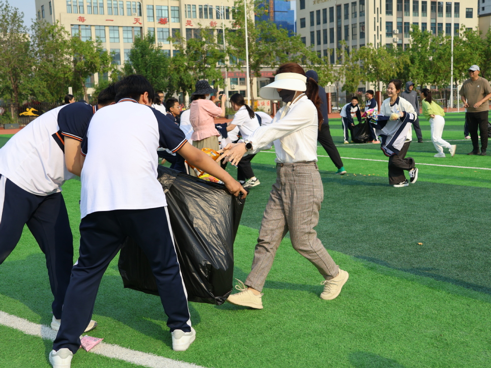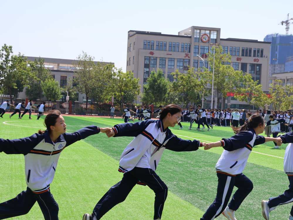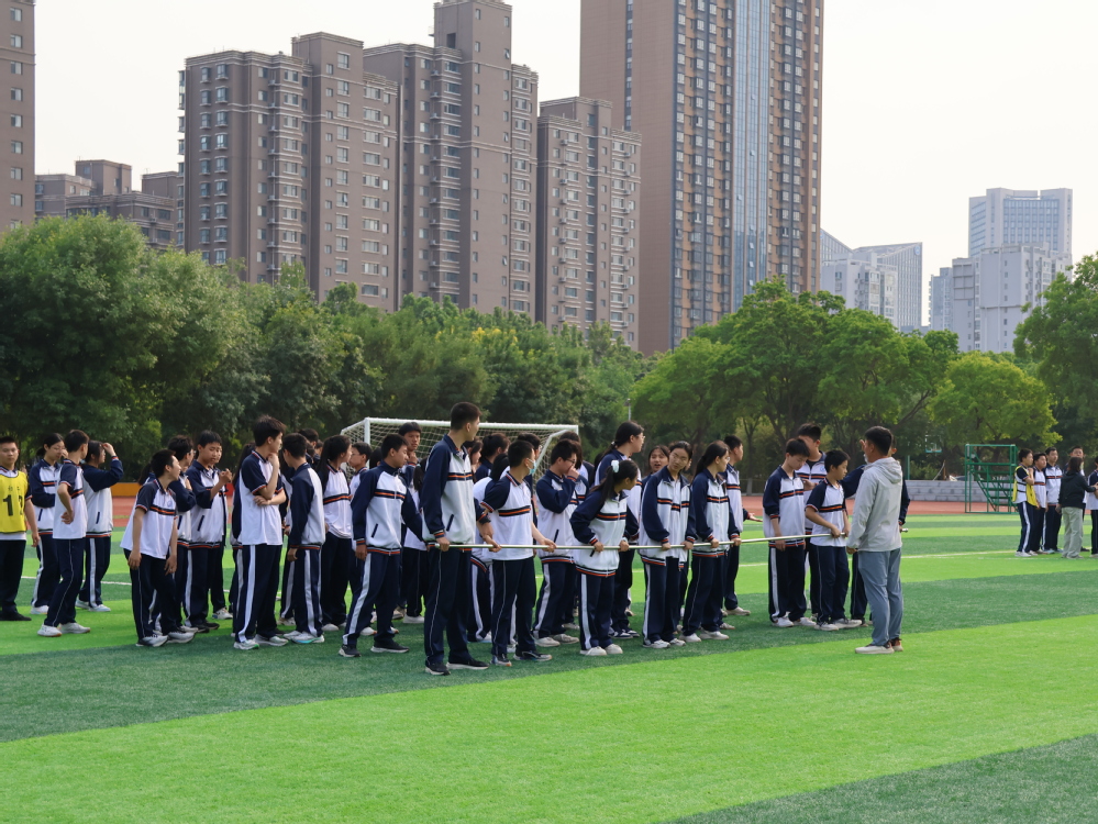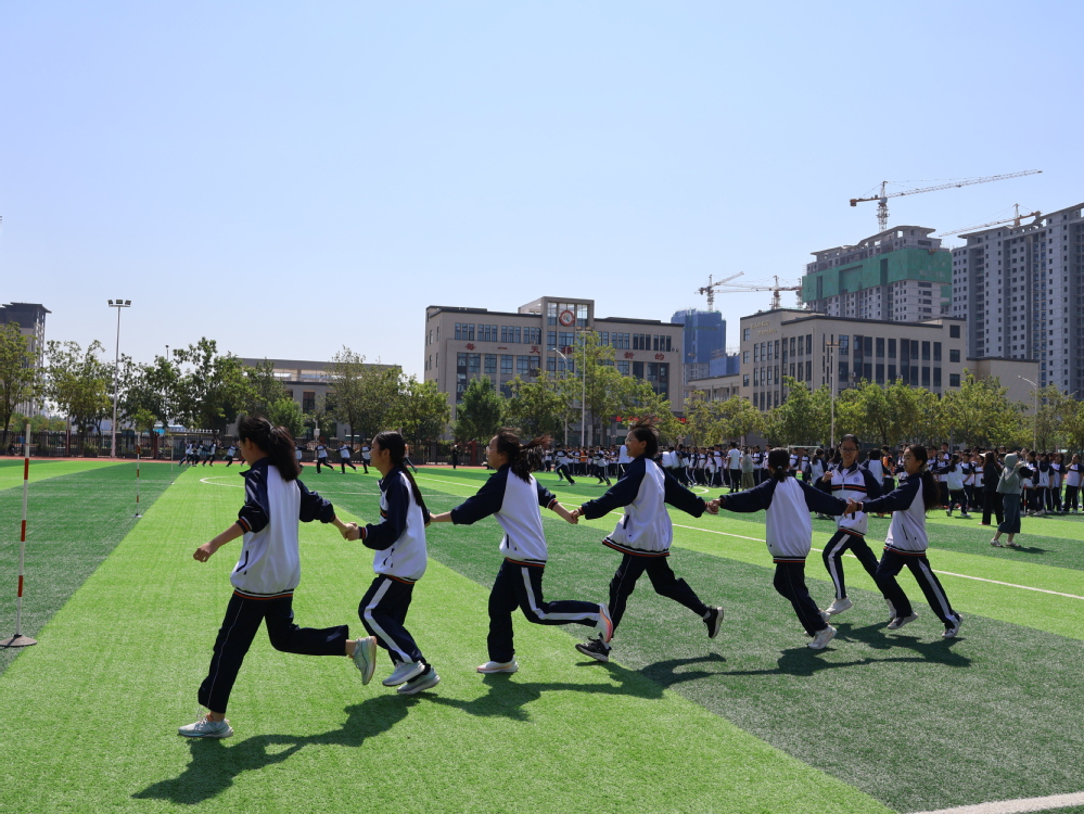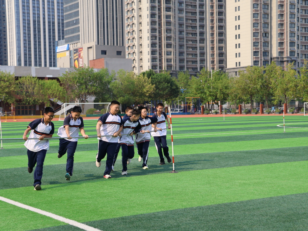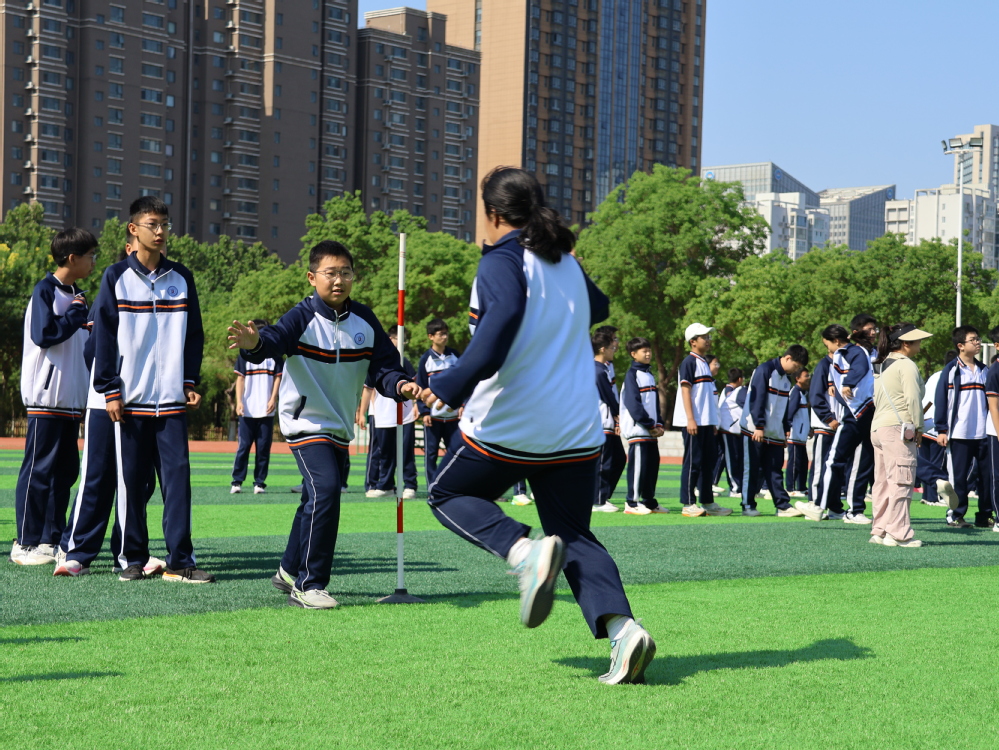 初一年级进行了“螃蟹赛跑”和“滚雪球”两场比赛。同学们默契配合,奋力拼搏,赛场上的欢笑声和加油声此起彼伏。