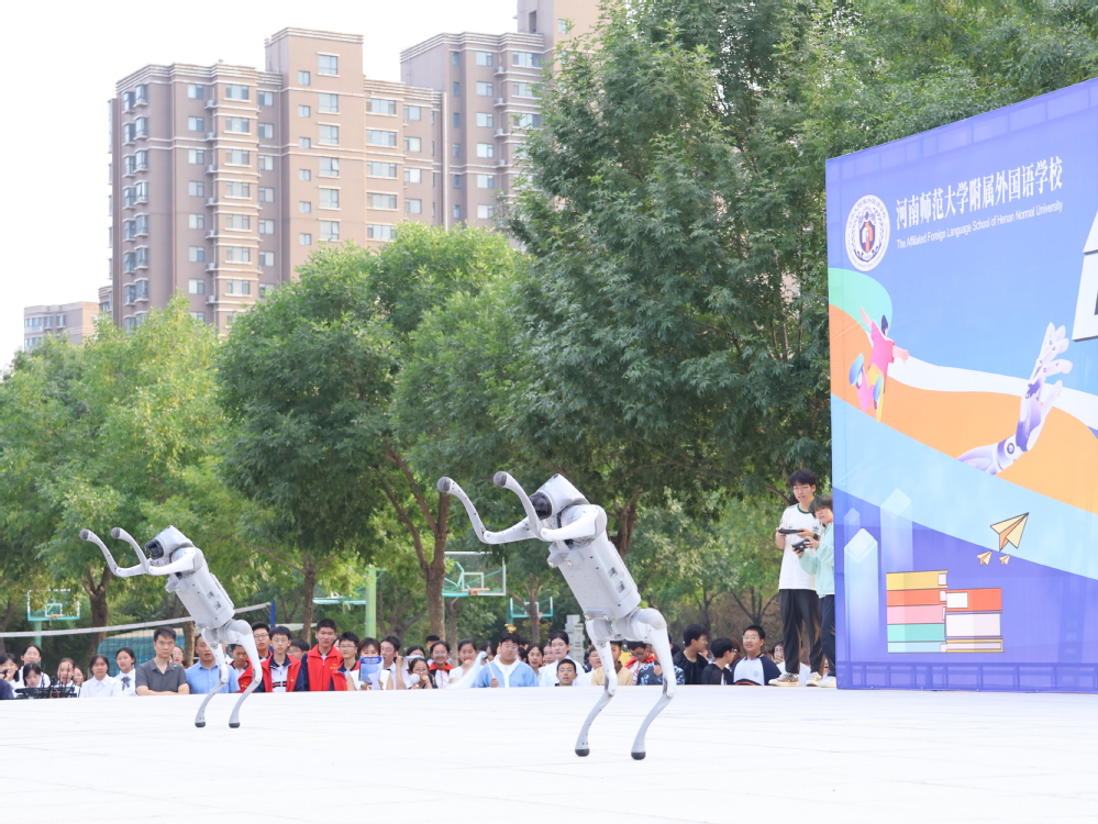紧接着,河师大软件学院的“科技双子星” 机器狗惊艳登场!它们以灵动肢体表达问候、变换队形,复杂的动作展示得流畅整齐,诠释算法编程与艺术表达的完美融合,让科技展现可触摸的温度。