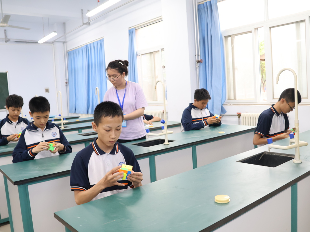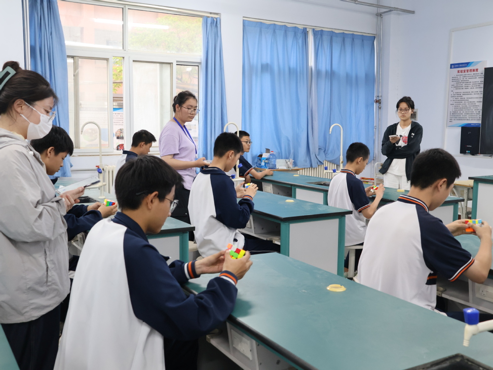 5月22日下午魔方比赛开始,来自各班级的高手齐聚一堂,在裁判的指令下展开激烈角逐。指尖翻飞间,多彩魔方在他们手中快速旋转,选手们全神贯注,争分夺秒,展现出卓越的空间思维与手眼协调能力,魔方旋转声与计时器的滴答声交织成独特的科技韵律。