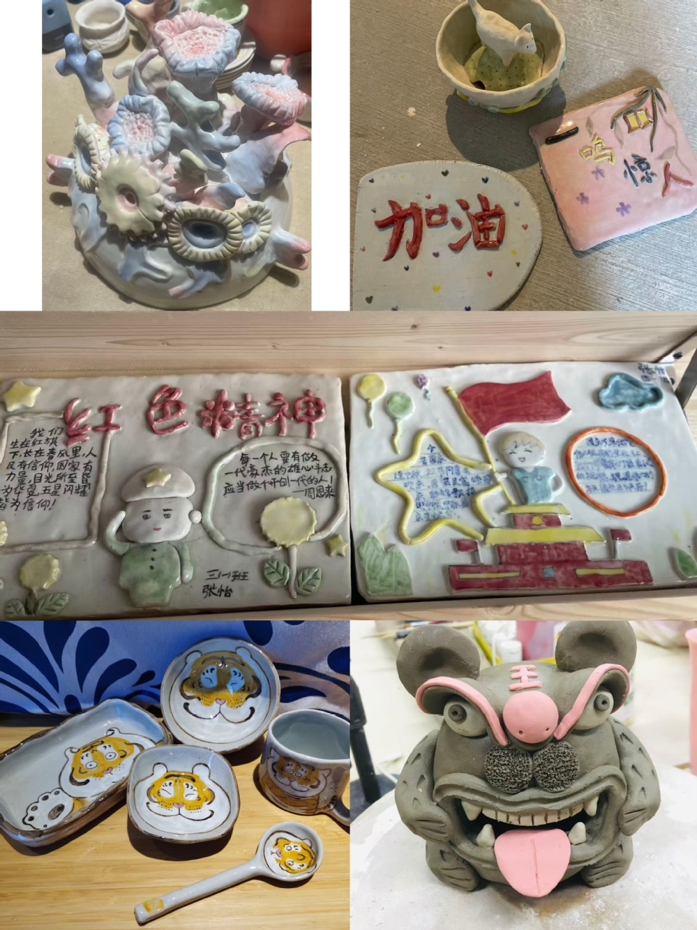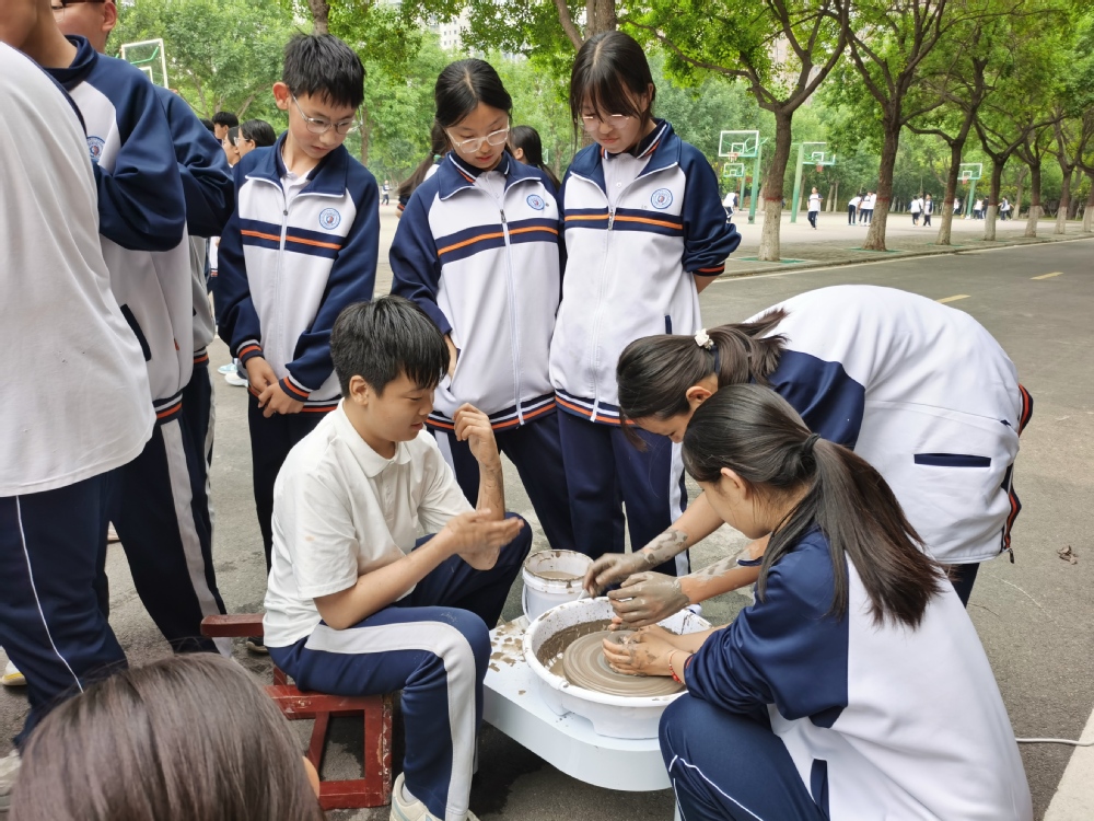 陶艺社团的展示区里,已烧制完成的陶罐、陶盘造型各异,或施以青釉显古朴雅致,或刻划花纹现灵动生机。社团成员耐心指导体验者将陶泥置于转盘中心,随着转速调整手势,让泥土在掌心逐渐成型。揉泥、拉坯、塑形,在指尖流转中感受陶艺创作的乐趣,同学们不仅体验了从泥土到艺术品的创作历程,更在指尖的温度中感知到匠人精神的深刻内涵。