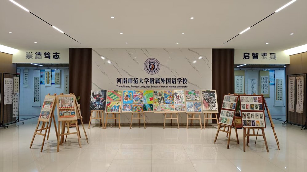 致精楼大厅的艺术展区宛如小型展馆,一幅幅书画作品风格各异,有的灵动飘逸,有的古朴典雅,吸引了众多师生驻足欣赏,为校园增添了浓厚的艺术氛围。遒劲有力的书法作品中,“书山有路勤为径” 的墨香与漫画故事里奇幻的校园故事相映成趣,创意中式古建速写以线条勾勒出飞檐翘角的精妙构造。师生在水墨丹青与光影构图间流连,感受着艺术创作中流淌的校园情怀与青春创意。