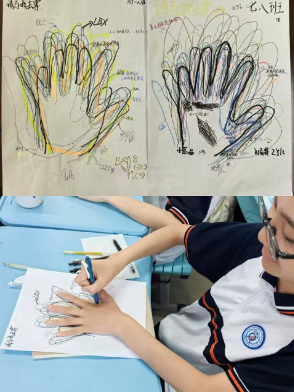 5、请和我击掌——瞬间支持,能量传递:在纸上画一只手掌,邀请同学与自己击掌,被邀请到的同学画上手掌轮廓并在一旁写上自己的名字、自己的愿望或互相鼓励的话语。学生们专注描绘,用心书写,创作了色彩斑斓、充满真诚的手掌画作。