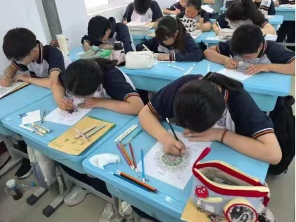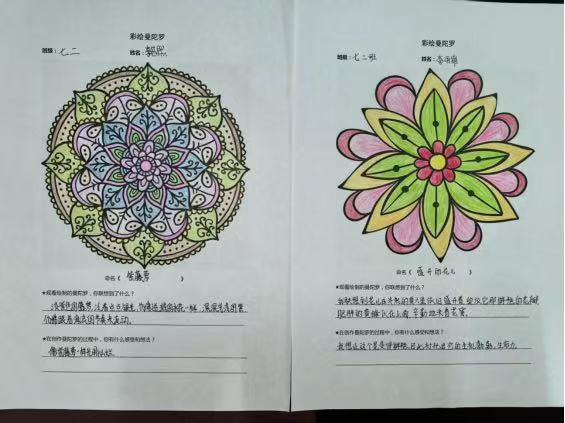 1、曼陀罗绘画(专注当下,表达自我):在教室,每位学生领取一张精美的曼陀罗线稿模板,学生在舒缓音乐中专注涂绘曼陀罗模板,体验专注与放松,觉察内心情绪,表达自我。曼陀罗绘画提供了专注与宣泄的出口。