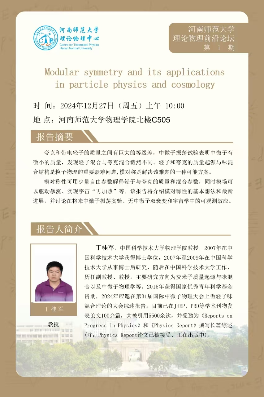 前沿论坛:Modular symmetry and its applications in particle physics and cosmology