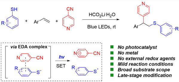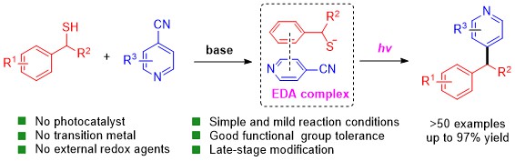 5.Jiaxuan Shen,* Jincan Li, Meijun Chen and Yimin Chen, Photocatalyst-free, metal-free, visible light-induced thiolation/pyridylation of styrenes using an electron donor-acceptor complex as a bifunctional reagent. Org. Chem. Front. 2023, 10(5), 1166-1172.