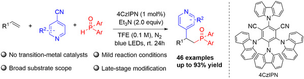 4.Jiaxuan Shen,* Yipin Zhang, Yanjiang Yu, and Manman Wang, Metal-Free Visible-Light-Induced Photoredox-Catalyzed Intermolecular Pyridylation/Phosphinoylation of Alkenes. Org. Chem. Front. 2021, 8(5), 901-907.