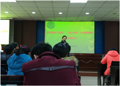 学生就业工作站、“沁心化苑”心理咨询室负责人杨明国、曹锟分别介绍了两个平台的筹建过程、服务功能、咨询流程等。
