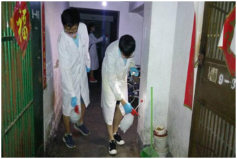 针对这些生活难题,队员们立即到居委会进一步了解详细情况。随后,队员们利用专业优势,在化学化工学院专业教师的指导下,在实验室配置了消毒药水;对家属区居民楼路道、地下仓库、部分居户家中喷洒了消毒药水。在消毒的同时,服务队员向居民们热心讲解了灾后如何进行环境清理和疾病预防。