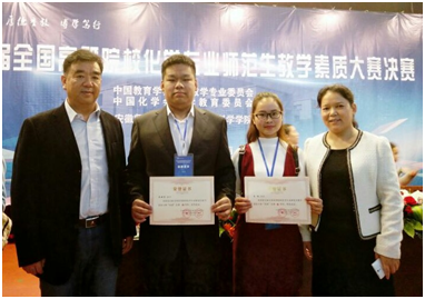 我院高度重视此次比赛,在指导老师袁振东、刘玉荣等悉心指导下,参赛学生利用暑假积极准备。在初赛“教学设计”阶段,全国共有约1200名选手提交作品,化学化工学院推荐的20项参赛作品全部获奖。其中温仕芳、李帆、张乾丰、余永芝、张江华5位同学获得一等奖,冯红娟等10位同学获二等奖,另有5名同学获三等奖。在决赛“现场说课”阶段,来自北京师范大学、华东师范大学等72所师范院校共124名化学专业本科生参赛,特等奖获奖比例为20%。温仕芳和李帆不负众望、脱颖而出,这是我院化学专业本科生连续第五次获得该项赛事的特等奖。