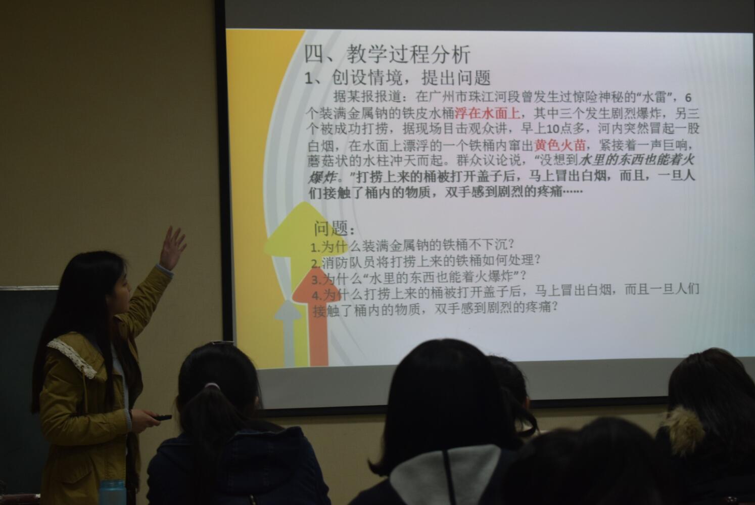 活动前期,工作人员利用学院微博,微信和空间三大网络平台进行积极宣传,为活动的具体流程和相关事宜做好了充分准备。比赛当晚,会场主持人首先宣读了比赛规则和评分标准,各位选手按照编号依次上场。选手们充分利用PPT和教学用具,多角度切入所讲知识点,给听众不一样的感受。其中,2014级肖铭台风成熟大气,言简意赅,利用化学反应精确地把握了课堂重点,吸引了观众的眼球。2016级的王黎瑛则以一口流利的英语,以热门话题作引,为观众呈现了一场别开生面的英语课堂,方式新颖,引人入胜。此外,有的选手用传统书写板书的方式,讲解化学方程式,展示了我院人的风采。最后,评委们从着装、台风、PPT制作、互动等多方面对参赛选手进行了详细点评。据悉,本次大赛将评选出讲课说课各一等奖一名、二等奖两名、三等奖三名,颁发证书,并推选共四名同学参加校级比赛。
