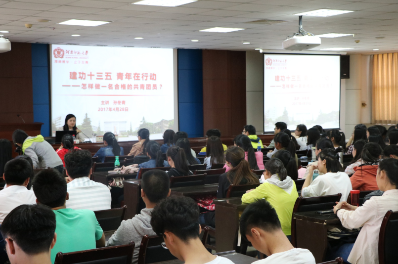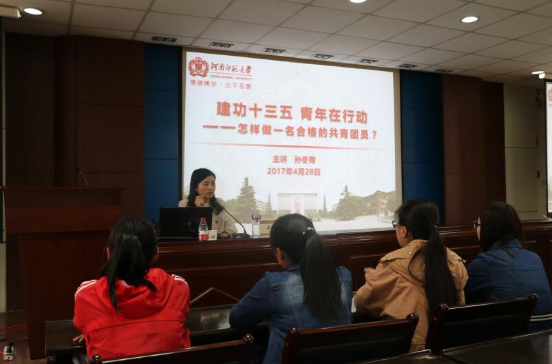 孙冬青以“做一名合格的共青团员”为题,从“什么是共青团,共青团能为青年做什么,共青团应如何改革和发展”三个问题为切入点,为同学们上了一堂精彩的团课。在团课中,孙冬青就中国共青团的发展史、基本任务、组织要求及改革方向等方面进行了详尽阐述,并从坚定理想信念、练就过硬本领、勇于创新创造、矢志艰苦奋斗、锤炼高尚品格等五个层面和生动形象的事例强调了做一名合格共青团员的重要意义,引发广大团员积极思考和思想共鸣。最后她勉励同学们,要坚定实现伟大复兴中国梦的信心,勇于承担起中国未来的重担,为实现中国梦作出积极贡献。