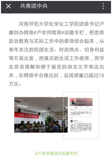 近日,共青团中央官方微信平台发表了《从严治团,河南线上线下融合发展推进》一文。该文在阐释“改作风管好团的干部”时,选取了我院团委书记卢鑫创办的网络“卢老师微语”话题专栏作为典型,并配图进行说明。