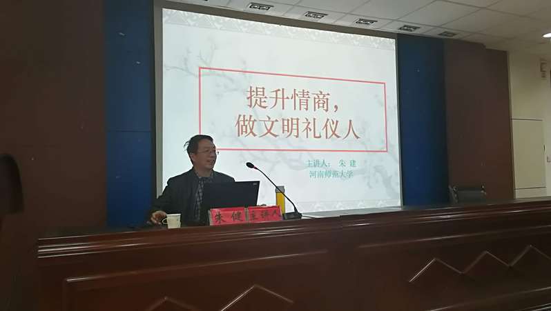 朱建以“提升情商,做文明礼仪人”为主题,从EQ与礼仪、育好情商两个方面来阐述如何做一名文明礼仪人。朱建对礼仪一词有着独特的理解,通过多个小故事告诉学生要“讲秩序、讲情义、讲变通”,并详细说明了IQ与EQ的关系,介绍了“怀才不遇、春风得意、一生平安、贵人相助”等几种不同人生境界,指出只有IQ与EQ双高才能成就成功人生。朱建强调,育好情商,就是要做到“和、分、温、良、恭、俭、让”;通过人我合一、学会感恩、善意沟通来完善情商,从而有效提升人格魅力。整场讲座,朱建以幽默风趣的语言,让与会师生在愉悦活泼的氛围中接受了教育。
