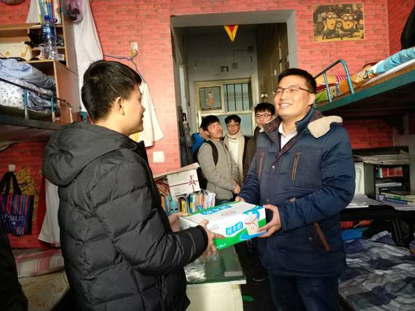 学院团委书记、2017级辅导员卢鑫与兼职辅导员逐一到2017级本科生宿舍给学生们送上了“助考牛奶”,希望能够助力每位学生备战期末考试。老师们亲切询问学生近期的生活及学习情况,鼓励他们放下思想包袱,充分利用时间认真复习,攻坚克难,以良好的心态迎接大学生涯中的第一次考试,争取取得优异的成绩。一箱箱牛奶,不仅仅是物质上的关怀,更多的是对学生精神上的鼓励。同学们纷纷表示,一定不负老师期望,认真复习,迎难而上,争取优异成绩回报学校、学院的关怀与厚爱。