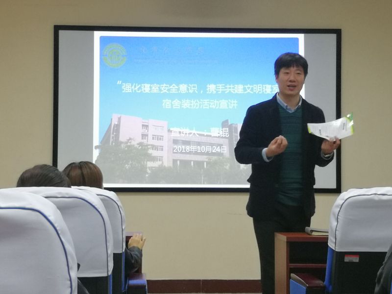 为加强学院学生宿舍文化建设,营造一个安全、文明、舒适的学习、居住氛围。10月24日晚,化学化工学院在化学北楼N102会议室召开以“强化寝室安全意识,携手共建文明寝室”为主题的宿舍装扮活动动员会。院团委副书记曹锟、2018级辅导员马捷航及全体寝室长参加会议。