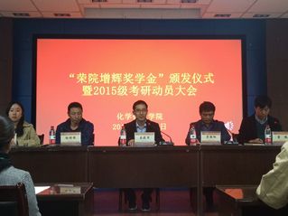学院党委副书记李朝阳详细介绍了该奖学金设置的背景与初衷、资金的来源与筹措、选拔标准与流程等内容,并宣读了本届获奖学生名单。同时,他为在座考研学生从综合实力、科研水平、师资力量、发展前景等内容介绍了学院的情况,欢迎大家积极报考。随后,主席台领导为获奖学生颁发了奖学金。2014级物理化学研究生、奖学金获得者翟利勇发言,他表示要不忘初心,砥砺前行,背负“荣院增辉”奖学金的光芒在今后的学习、科研道路上积极进取、为院增光。2015级曹豆豆代表报考本院学生发言,她表示四年的大学生活让她更加热爱师大、热爱化院,自己会更加勤奋努力、积极备考,继续自己与师大化院的缘分。