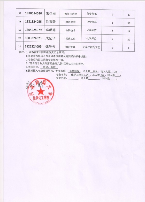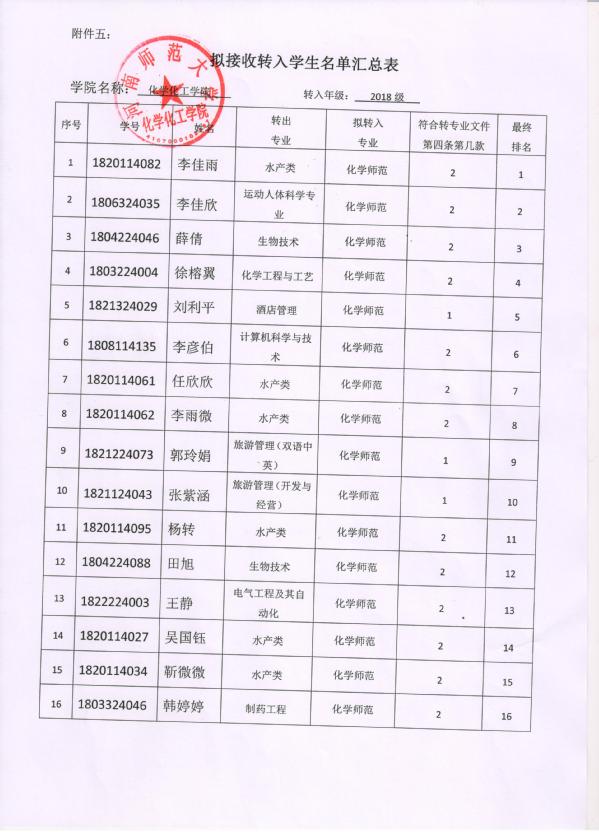 2019年化学化工学院转专业工作拟接收入学学生名单公示