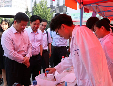 砥砺奋进创一流,礼献建国七十载。5月25日至26日,由我院和科技处、学生处、教务处、研究生院、学科建设办公室、团委、就业指导服务中心等部门联合开展的第二届“魅力化学”科技文化推广日活动顺利举行。5月25日上午,活动开幕式在图书馆前广场举行,校长常俊标、副校长刘玉芳出席开幕式,相关职能部门和附属小学负责人,学院领导班子成员,师生代表共1500余人参加开幕式。开幕式由学院党委书记来俊军主持。
