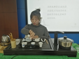 首先,茶艺社学习部部长刘炳汝以茶叶历史为源头,从茶叶知识、茶艺技巧等方面,深入浅出地讲解了中国博大精深的茶文化,以及如何选茗、择水、泡茶等茶艺技巧,并以PPT形式向社员们简单介绍了茶叶的六大种类种类、“茶道六君子”及其各自的用途。接着,学习部干事刘芊妤向社员们完整的展示了泡茶步骤,并展示了“凤凰三点头”等专业泡茶技艺。附着袅袅清香的茶水缓缓在茶碗、公道杯、闻香杯辗转,从温杯置茶到冲泡奉茶品茶,循序渐进,茶香沁人。最后,三位社员毛遂自荐上台学习实践,从每一个步骤中感受茶道的博大精深,从每一盏茶中品茗古典韵味、感悟人生。