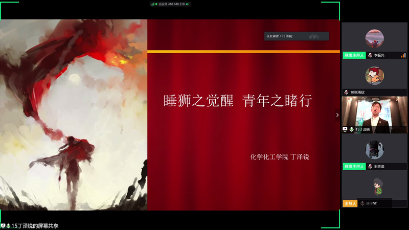 本次比赛采用视频会议的方式进行,选手们用他们自信的语言、大方的气势,结合精心制作的PPT讲述了疫情防控阻击战中我国取得的成果,并通过在疫情期间自己的所见、所闻、所思、所感,生动诠释了中国特色社会主义的制度优势。比赛中,一些选手以本次疫情阻击战中青年的奉献为出发点,展示新一代中国青年勇担当,敢作为的优秀精神面貌,同时进一步结合五四精神,号召同学们提升自身能力,争做时代优秀青年。选手们各个精神饱满、声情并茂,精彩的宣讲得到评委的认可。经过激烈的角逐,丁泽锐、赵莹莹同学凭借精彩的演讲,获得比赛的桂冠。