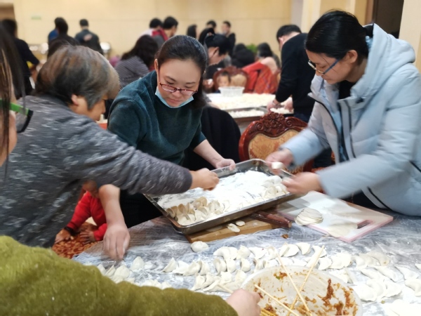 经过前期充分准备,参加活动的老师们带着案板、擀面杖、饺子盘等装备,准时来到了学术交流中心一楼北餐厅,接下来三人一小组、五人一大组围桌而坐,开始忙活起来。老师们热情高涨,有的专注于和面,有的忙于切面擀皮儿,有的则是娴熟地包起了饺子,更有一些小朋友充当起了面皮“搬运工”,大家忙的不亦乐乎,餐厅内不时传来阵阵笑声,气氛极其融洽。经过两个小时的不懈努力,几十盘饺子顺利完工,看着眼前的成果,大家无比愉悦。