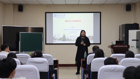 1月1日下午,学院邀请校国际合作与交流处、港澳台办公室主任赵扬在化北N102会议室作 “国际化人才培养思考”报告。报告会从“为什么要培养国际化人才”、“什么是国际化人才”以及“如何培养国际化人才”三个方面展开。首先,她借用习近平总书记在2022年新年贺词中的“同一个地球,同一个未来”一句话,深刻指出培养国际化人才在未来世界发展中的重要性。接着,赵杨从“四看”即:从中国看中国、从中国看世界、从世界看中国、从世界看世界,指出当今中国应该培养大批具有国际视野,通晓国际规则,能够参与国际事务与国际竞争的国际化人才。最后,她勉励全体学员要立鸿鹄之志,脚踏实地,学好专业知识,多去拓展自己,努力成为卓越国际化人才。