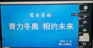 活动紧紧围绕着冬奥精神和青春力量的主题开展。团支部助理姜文锞向社员们介绍举办此次团日活动的重要意义。首先,社员们观看了冬奥会开幕式的精彩片段,分享自己观看冬奥会的感悟并对参赛运动员优异的表现表示赞美。紧接着,在知识竞答环节,社员踊跃参与,弹幕接连不断。最后,团支书进行总结发言:“北京冬奥会既是一个体育竞技的舞台,也是一扇亮丽的‘中国窗口’,作为青年大学生,我们感到骄傲与自豪。同时,我们也应努力学习,日后为祖国的建设添砖加瓦。不忘初心,砥砺前行。”