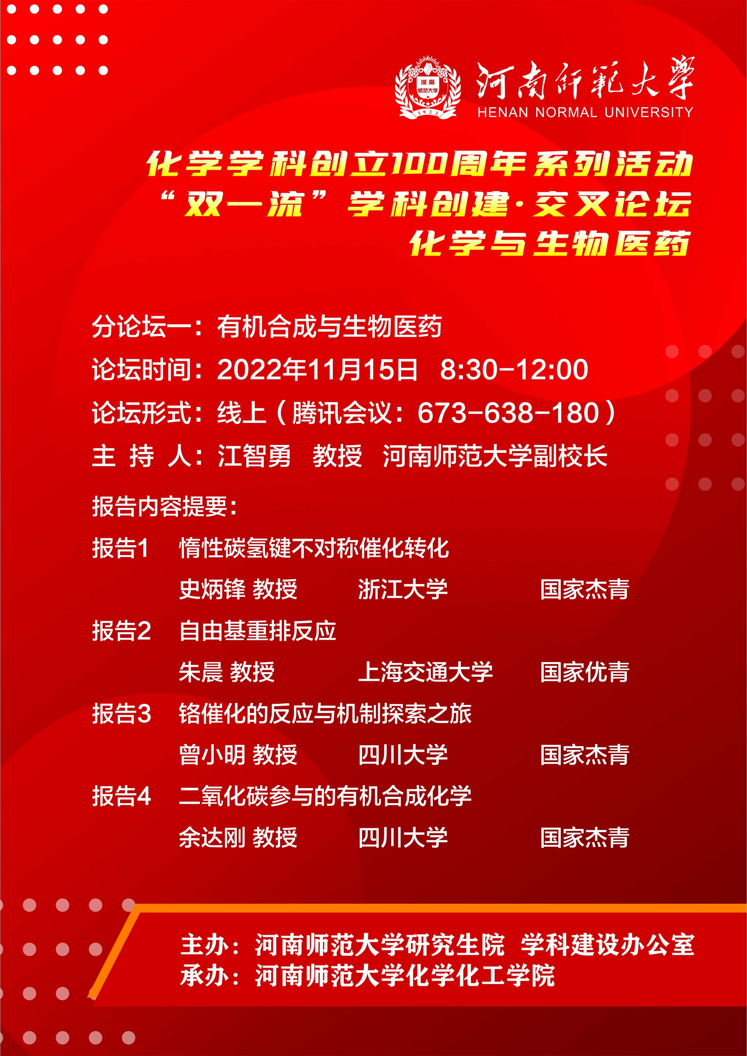 十秩峥嵘薪火相传,百年师大风华正茂。值此化学学科创立100周年,为营造浓厚的创新文化氛围,打破传统的学科专业壁垒,激发不同学科团队间的合作意愿,摆脱惯性思维,抓住科研范式变革的机遇,凝练孕育一批新的研究领域和方向,化学学科围绕“化学与生物医药”主题开展系列交叉融合创新论坛。讨论最新学科进展,交流新思想和新方法,分析学科的增长点以及学科交叉中的新问题,进一步加强化学与生物医药研究的交叉融合,提升化学学科的原始创新能力和关键领域核心技术攻关能力,推动学科交叉融合迈上新台阶,为高水平科技创新和高质量人才培养提供重要支撑。学科交叉论坛的实施将助力化学在高水平学科建设上展现更大作为,再攀高峰,有力驱动 “双一流”学科创建。