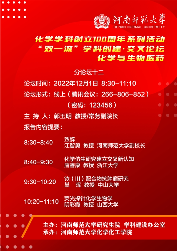 十秩峥嵘薪火相传,百年师大风华正茂。值此化学学科创立100周年,为营造浓厚的创新文化氛围,打破传统的学科专业壁垒,激发不同学科团队间的合作意愿,摆脱惯性思维,抓住科研范式变革的机遇,凝练孕育一批新的研究领域和方向,化学学科围绕“化学与生物医药”主题开展系列交叉融合创新论坛。讨论最新学科进展,交流新思想和新方法,分析学科的增长点以及学科交叉中的新问题,进一步加强化学与生物医药研究的交叉融合,提升化学学科的原始创新能力和关键领域核心技术攻关能力,推动学科交叉融合迈上新台阶,为高水平科技创新和高质量人才培养提供重要支撑。学科交叉论坛的实施将助力化学在高水平学科建设上展现更大作为,再攀高峰,有力驱动 “双一流”学科创建。
