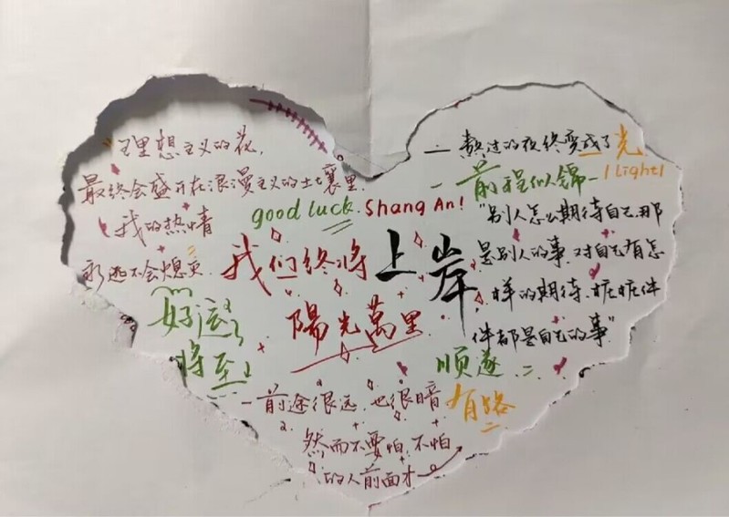 此次活动于11月26日至27日进行作品征集,随后经过一系列评选在12月9日展示活动优秀作品。在活动准备阶段,爱心互助社通过官Q进行活动宣传,鼓励同学们积极报名参加。活动期间,同学们踊跃参与,各展才能,充分发挥自己的想象力和创造力,通过拍摄视频、手写祝福语等多种形式完成了自己的活动作品,满含对考研学子的殷切祝福。其中不乏一些十分优秀的动人佳作——手写祝福语感情真挚,以文字为载体传达关心和祝福;手抄报图文并茂,描绘出凛冬终去、星河长明的美好愿景。这些作品将在后期通过微信平台、官方QQ推送给学院考研学生。
