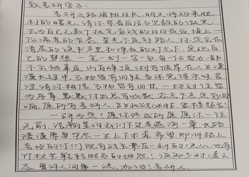 须知少时凌云志,曾许人间第一流。此次活动旨在帮助考研学子坚定备考信心和缓解压力,传递温暖和力量,同时也鼓励同学们以刻苦的考研学子为榜样,激发大家的学习热情。