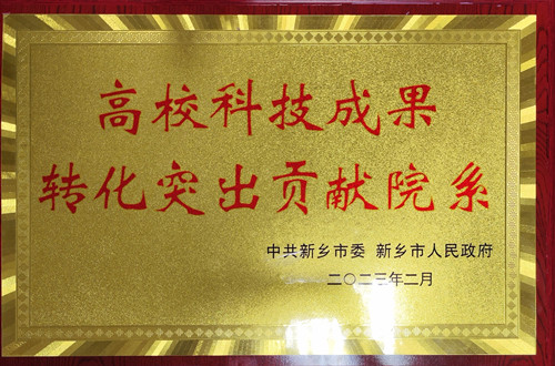 3月14日下午,中共新乡市委、新乡市人民政府召开2023年驻新高校座谈会。中共新乡市委书记李卫东出席会议,各县、市、区、市直机关和驻新高校主要负责同志参加会议。会上宣读了《中共新乡市委 新乡市人民政府对助推新乡经济社会高质量发展贡献突出高校院系予以表扬的通报》并举行了颁奖仪式,我院被授予高校科技成果转化突出贡献院系。