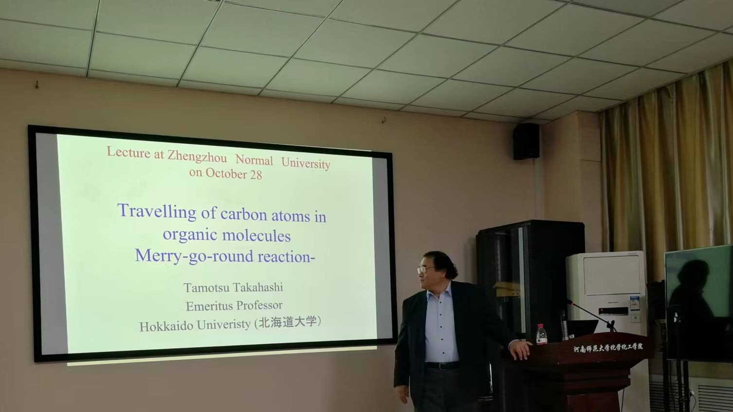 10月28日上午,应化学化工学院邀请,日本北海道大学Tamotsu Takahashi教授和中国科学院上海有机化学研究所刘元红研究员为我校师生分别作题为“Travelling of carbon atoms in organic molecules Merry-go-round reaction (碳原子在有机分子中的循环移动)”和“多官能团化金卡宾的形成策略与转化”的学术报告。学术报告会在化学北楼N102报告厅举行,学院相关师生参加了本次学术报告会议。报告会由科技处副处长李苞教授主持。