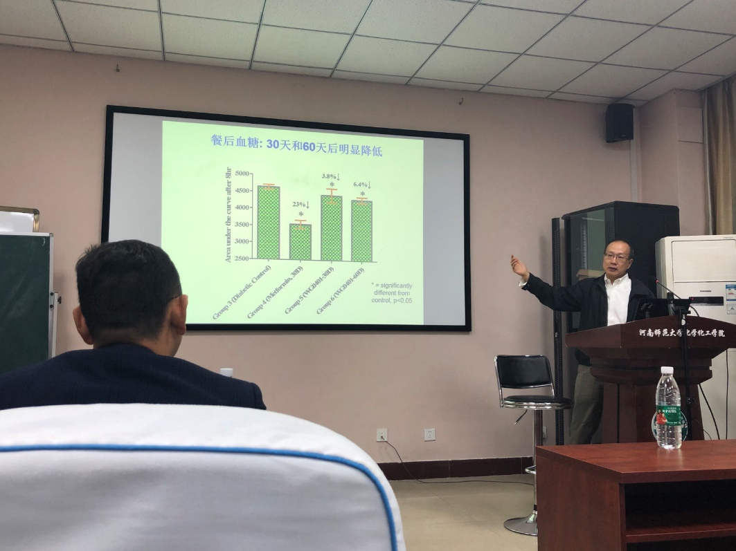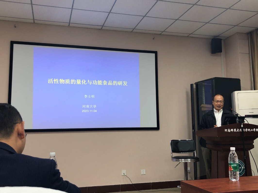 河南大学李士明教授做客百年校庆之俊甫讲堂 11月4日,应化学化工学院邀请,河南大学李士明教授为我校师生作题为“活性物质的量化与功能食品的研发”的学术报告,化学化工学院相关师生参加了报告会议。报告由化学化工学院丁清杰教授主持。李士明教授结合自己的研究工作,对其研究领域的现存问题,改进方案及未来面临的挑战、机遇作了详细的介绍、阐述,使广大师生受益匪浅。报告结束后,李士明教授就与会师生提出的相关问题进行了详细的解答,并展开了深入的讨论与交流。