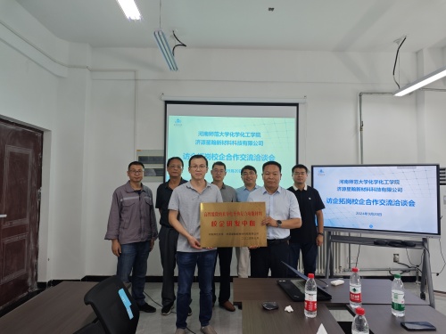 化学化工学院副院长在济源星翰新材料科技有限公司,副总经理郭少征对党治国一行表示热烈欢迎。他带队参观了公司分析化验实验室和生产车间,并详细介绍公司生产经营情况、主要产品以及产学研合作和成果转化情况等方面。党治国、济源星翰新材料科技有限公司相关领导共同为“高性能微纳米导电导热复合功能材料校企研发中心”授牌。