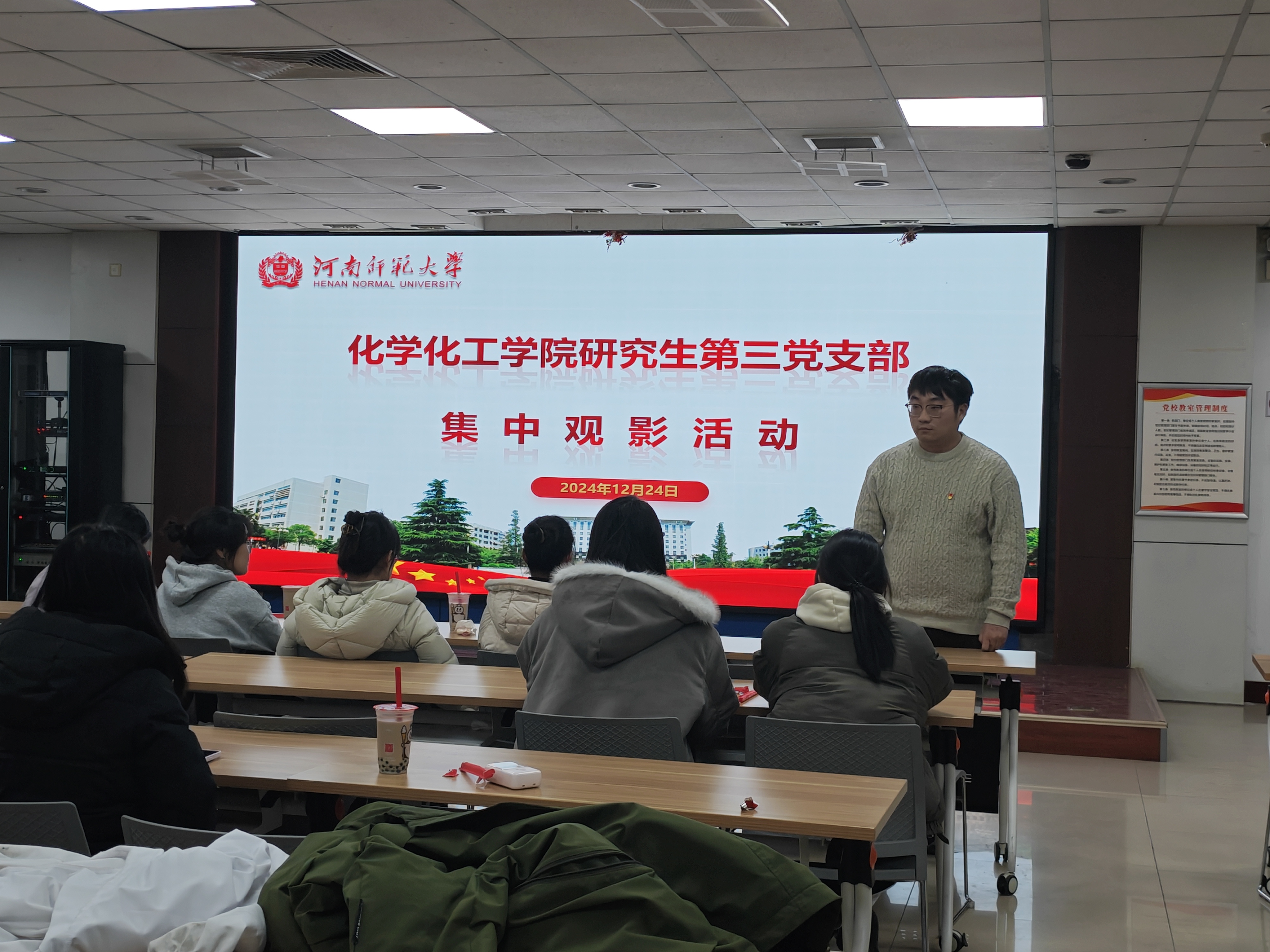 为大力弘扬爱国主义精神,切实加强党员的思想政治教育,丰富党员组织生活,12月24日晚,我院研究生第三党支部在化学北楼五楼会议室开展了“铭记历史强党性,青春向党铸担当”电影《金刚川》集中观影活动,支部全体党员参加。