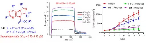 在药物研发领域,三环嘌呤核苷因其独特的结构占据重要地位。该研究团队设计合成了一系列三环嘌呤核苷类化合物,通过构效关系(SAR)研究表明,合成的大多数三环嘌呤核苷化合物具有中等到强效的抗肿瘤活性。其中,化合物20b对HCT116细胞表现出显著的抗增殖活性,其体外抗肿瘤细胞增殖活性优于抗肿瘤临床用药顺铂。作用机制研究表明,化合物20b可以明显抑制HCT116细胞的转移和侵袭,将细胞周期阻滞在G0/G1期;化合物20b增加了HCT116细胞中的ROS水平,导致DNA损伤、内质网(ER)应激和线粒体功能障碍,并诱导细胞凋亡,且影响PPIA/MAPK信号通路相关蛋白的表达水平。药物亲和反应靶向稳定实验(DARTS)、细胞热转移实验(CETSA)和小干扰RNA(siRNA)实验结果表明,化合物20b靶向PPIA;小鼠移植瘤实验表明,化合物20b具有良好的体内抗结肠癌活性和较低的毒性。这些结果表明,化合物20b是一类有效的PPIA抑制剂类抗肿瘤化合物,值得进一步深入研究开发。