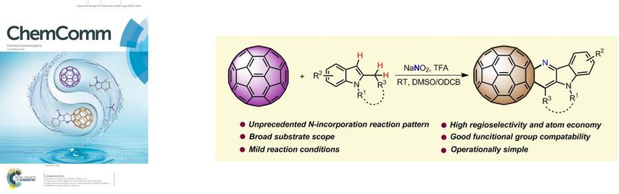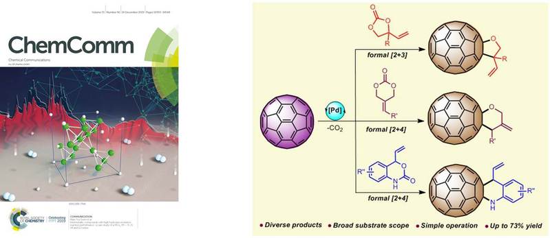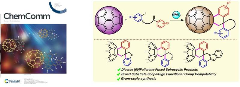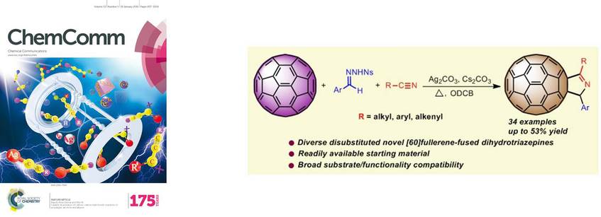 19. Jinliang Ma, Tong-Xin Liu,* Pengling Zhang, Chuanjie Zhang, Guisheng Zhang* Palladium-catalyzed domino spirocyclization of [60]fullerene: synthesis of diverse [60]fullerene-fused spiro[4,5] /[5,5] derivatives Chem. Commun., 2021, 57, 49−52. • Selected as the Inside Front Cover • Highlighted by X-MOL • Highlighted by RSC China 18. Conghui Wu, Tong-Xin Liu,* Pengling Zhang, Xue Zhu, Guisheng Zhang* Iron-Catalyzed Redox-Neutral Radical Cascade Reaction of [60]Fullerene with γ,δ-Unsaturated Oxime Esters: Preparation of Free (N–H) Pyrrolidino[2¢,3¢:1,2]fullerenes Org. Lett., 2020, 22, 7327−7332. • Highlighted by CBG News