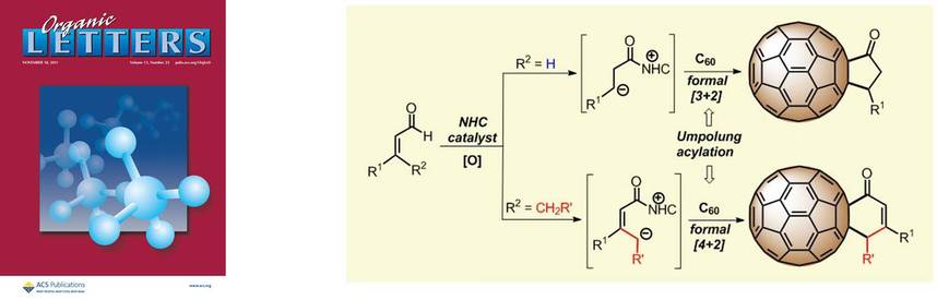 12. Beibei Hu, Tong-Xin Liu,* Pengling Zhang, Qingfeng Liu, Jingjing Bi, Lei Shi, Zhiguo Zhang, Guisheng Zhang* N‑Heterocyclic Carbene-Catalyzed α,β-Unsaturated Aldehyde Umpolung in Fullerene Chemistry: Construction of [60]Fullerene-Fused Cyclopentan-1-ones and Cyclohex-2-en-1-ones Org. Lett., 2018, 20, 4801−4805. • Highlighted by Synfacts, 2018, 14, 1303. • Highlighted by CBG News 11. Tong-Xin Liu,* Shaoshuai Hua, Nana Ma, Pengling Zhang, Jingjing Bi, Zhiguo Zhang, Guisheng Zhang* Reactivity and Synthetic Applications of a-Functionalized Oxime Acetates: Divergent Access to Fulleropyrrolidines and Mono- and Disubstituted 1-Fulleropyrrolines via Copper-Catalyzed Redox-Neutral N-Heteroannulation with [60]Fullerene Adv. Synth. Catal., 2018, 360, 142−152.