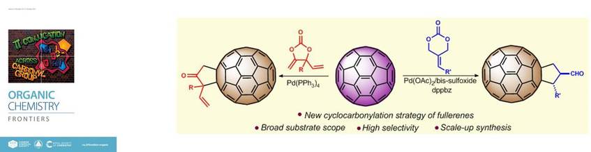 23. Tong-Xin Liu,* Chuanjie Zhang, Pengling Zhang, Xin Wang, Jinliang Ma, Guisheng Zhang* Palladium-catalyzed decarboxylative [2 + 3] cyclocarbonylation reactions of [60]fullerene: selective synthesis of [60]fullerene-fused 3-vinylcyclopentan-4-ones and cyclopentane-4-carbaldehydes Org. Chem. Front., 2022, 9, 5564−5570.