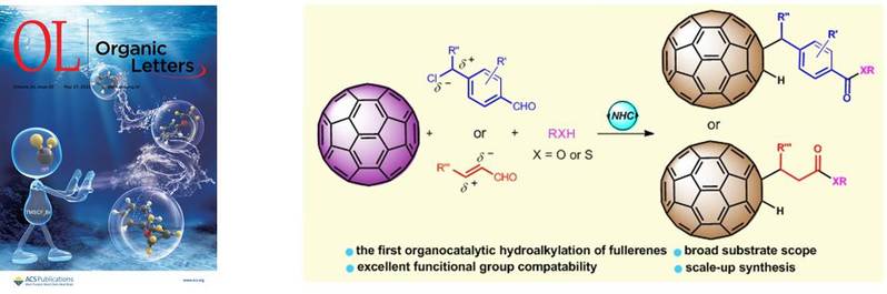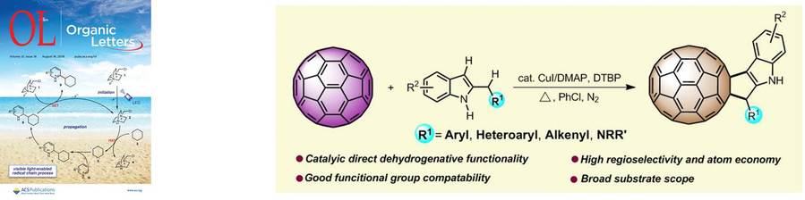 16. Qingfeng Liu, Tong-Xin Liu,* Yifei Ru, Xue Zhu, Guisheng Zhang* Palladium-catalyzed decarboxylative heterocyclizations of [60]fullerene: preparation of novel vinyl-substituted [60]fullerene-fused tetrahydrofurans/pyrans/quinolones Chem. Commun., 2019, 55, 14498−14501. 15. Tong-Xin Liu,* Juan Wei, Pengling Zhang,* Yifei Ru, Jinliang Ma, Xingjie Zhang, Nana Ma, Guisheng Zhang* Copper-Catalyzed N−H/C−H Sequential Relay Oxidative Radical Carboannulation: Construction of Diversely Substituted [60]Fullerene-Fused Tetrahydrocyclopenta[b]indoles Org. Lett., 2019, 21, 6461−6465. • Highlighted by CBG News 14. Qingfeng Liu, Tong-Xin Liu,* Nana Ma, Chenhao Tu, Ruoya Wang, Guisheng Zhang* Cu(II)/Mn(III)-Promoted Synergistic Radical N‑Heteroannulation Reaction: Synthesis of [60]Fullerene-Fused Tetrahydroquinoline Derivatives J. Org. Chem., 2019, 84, 7255−7264.