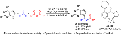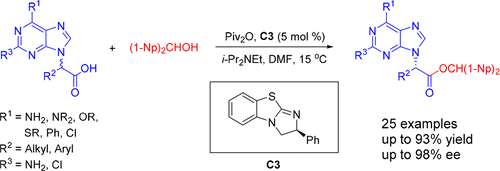 [7]Huifang Zhang, Mingsheng Xie,* Guirong Qu, and Junbiao Chang* Dynamic Kinetic Resolution of α-Purine Substituted Alkanoic Acids: Access to Chiral Acyclic Purine Nucleosides, Org. Lett. 2019, 21(1), 120-123.
