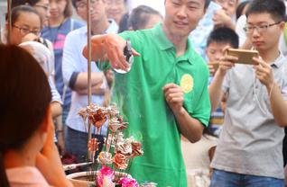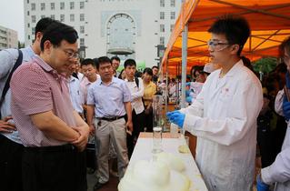 6月3日一早,实验展示区负责人,2014级兼职辅导员贾志超就带领研究生全体负责人员搭建仪器,准备实验设备,结合各自展示主题,做最后的准备。开幕式结束后,实验展示正式开始。其中,“纸树开花”实验使用用酸碱遇指示剂变色原理,将白色纸花变为其他绚丽的颜色,更有孩子们在纸上作画进行变色显示,实验人员在实验结束后,将变色的花朵和画作送给在场的观众们,受到了广泛好评。简单的洗涤剂甘油等原料也能做出神奇的“大象牙膏”实验,汹涌喷出的泡沫瞬间吸引住人们的视线。更有中学时著名的喷泉实验一解所有人的好奇心。他们用严谨的专业知识和绚烂的实验现象为现场观众奉献了一台华丽的化学科普盛会。 “这种活动十分有趣,将一般人看来不可思议的化学实验真实地显现大家面前,令人眼前一亮。”酒翔翔同学观看演示后说道