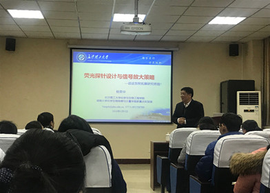 杨荣华教授作了题为荧光探针设计及信号放大策略:谈谈怎样拓展研究思路的学术报告。杨教授提出研究生怎样选择课题以及怎样做深入系统研究的问题,根据本课题组研究生的具体课题,详细介绍了在螺吡喃荧光探针及分子识别、DNA分子开关、细胞自助原位荧光放大等研究方向所取得的优秀成果,以及在解决此类问题时课题组成员怎样拓展研究思路。会后,杨教授同与会师生进行了现场互动交流,对提出的问题给予了细致耐心的解答,并同部分教师进行了座谈。