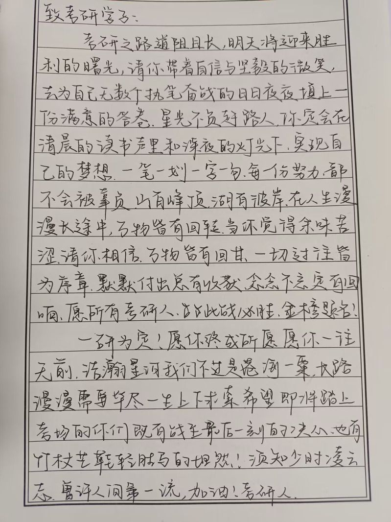 此次活动于11月26日至27日进行作品征集,随后经过一系列评选在12月9日展示活动优秀作品。在活动准备阶段,爱心互助社通过官Q进行活动宣传,鼓励同学们积极报名参加。活动期间,同学们踊跃参与,各展才能,充分发挥自己的想象力和创造力,通过拍摄视频、手写祝福语等多种形式完成了自己的活动作品,满含对考研学子的殷切祝福。其中不乏一些十分优秀的动人佳作——手写祝福语感情真挚,以文字为载体传达关心和祝福;手抄报图文并茂,描绘出凛冬终去、星河长明的美好愿景。这些作品将在后期通过微信平台、官方QQ推送给学院考研学生。