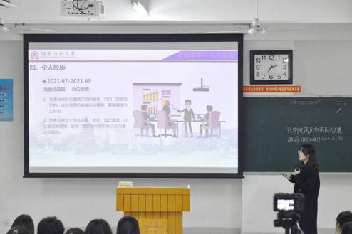 化“简”成蝶,职“面”未来。为帮助广大学生增强职业生涯规划意识,掌握求职简历制作方法,体验求职面试真实场景,11月26日晚,我院在文昌楼203教室举办院求职简历制作面试大赛复赛。河师大附中化学教研组组长刘凤梅,天力锂能人力资源部部长韩吉萍、院创新创业秘书张艳担任评委,参赛选手及学生代表共同参与。