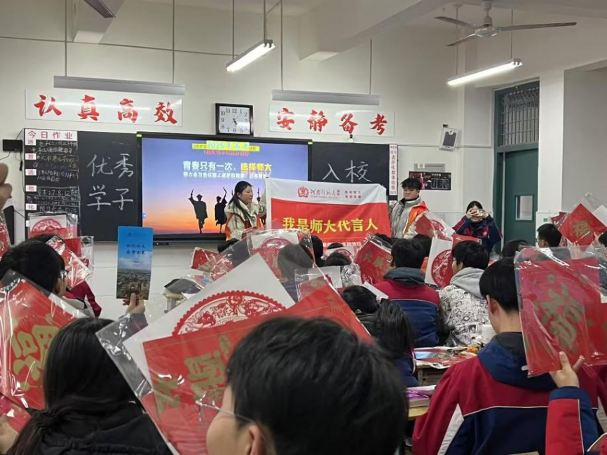 1月19日、1月27日,邹金艳团队在沈丘县第一高级中学正式开启宣讲。成员们向同学们发放精心制作的宣传手册和师大专属春联,生动地展现了我校卓越的办学成果与鲜明特色,精准契合了新高考改革的时代趋势,获得了同学们的信任和支持。