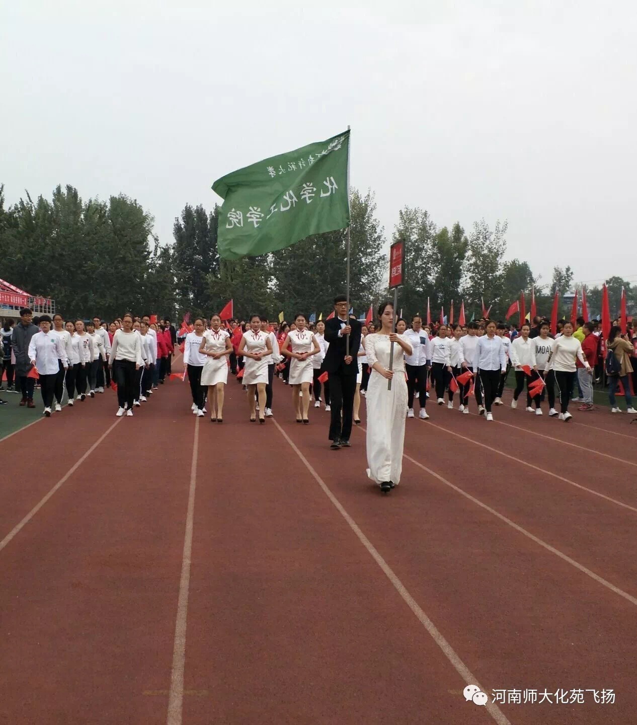 教练:教练-朋友 教练:“刚开始训练的时候,我对他(她)们都是比较严格的,一直给他(她)们纠正动作,加强训练强度。到后期的时候,不想让他(她)们过分紧张,有时候就会在训练之余,带着他们做一些有意思的小游戏,缓解压力,增添乐趣。期待他(她)们能够在比赛时发挥出自己的水平,取得好成绩!” 开幕式盛况: 10月11日上午八点半左右,伴着学校对化学化工学院的介绍词“190多位教职工和2000余名学生汇成了强大合力,凝聚着无穷希望。他们正在迎着十九大的喜讯,静候时代的发令枪。化学人在奋斗中沉淀94年的厚重历史,加速新的梦想反应碰撞;在追逐中合成火热的青春力量,推动新的未来扬帆起航。今天,相信运动场上的他们同样能以不懈的努力冲刺体育高峰,用汗水和拼搏赢得属于化学化工学院的荣光。”化学化工学院代表方队高举标志性的绿色院旗走过主席台,接受检阅。