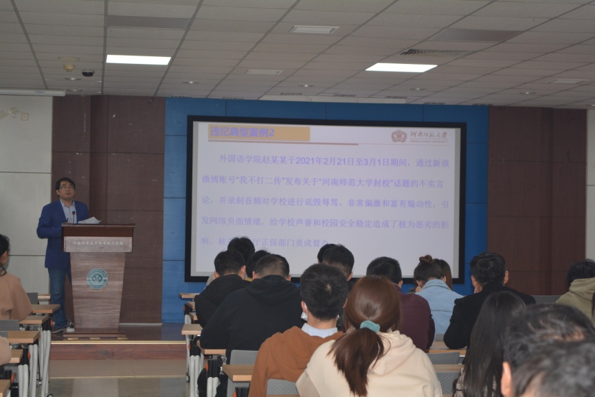 为促进研究生养成文明上网的良好习惯,教育引导研究生树立文明诚信意识,进一步培育优良学风,2021年3月24日,我院在化学北楼五楼会议室召开了研究生违纪典型案例警示教育大会,各年级辅导员和全体研究生同学参加了会议。 会上,研究生辅导员张艳、郝二军、王兰结合典型案例和本年级实际,组织全体研究生认真学习了《伟德官网下载苹果版研究生纪律处分管理办法(试行)》,进一步教育引导学生加强纪律意识,注意网络不是法外之地,自媒体也不是自由空间,任何造谣传谣、滋扰谩骂,扰乱网络秩序的行为,都要承担相应的纪律和法律责任;同时期望研究生同学要爱校荣院,树立远大志向抱负,不忘初心,立志报国! 会上各年级还进行了电信诈骗、实验室安全等方面的安全教育工作。