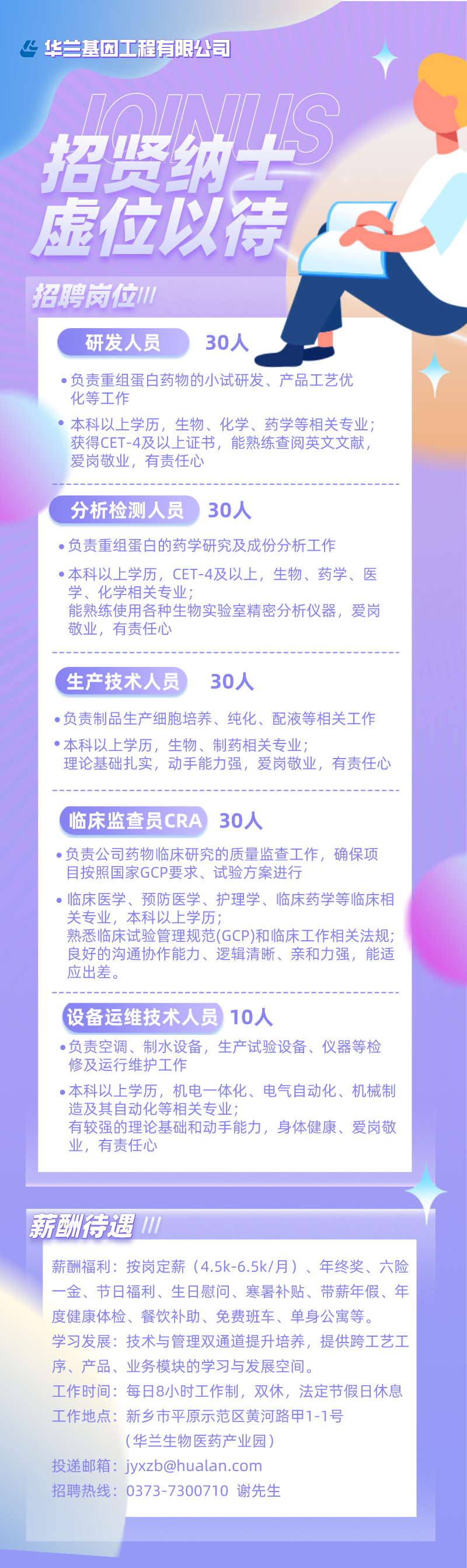 工作地点:新乡市平原示范区黄河路甲1-1号(华兰生物医药产业园)